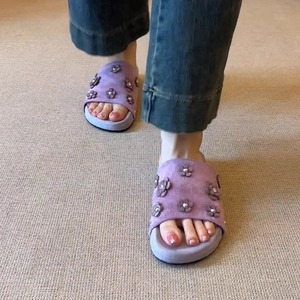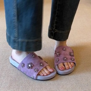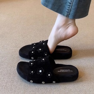 シープスキンバージョン~レトロニッチラインストーンフラワースエードサンダルレディース夏アウター厚底万能サンダル
