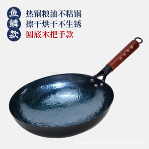 卸売 Zhangqiu 昔ながらの鉄鍋木製ハンドル魚鱗鍋家庭用ガスストーブ鍛造中華鍋コーティングされていないノンスティック鋳鉄鍋
