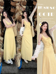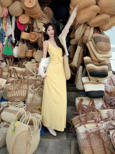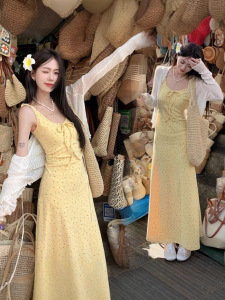 黄色碎花吊带连衣裙女装夏季别致绝美海边度假风收腰沙滩裙