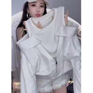 2025春夏新款露肩设计宽松休闲显瘦圆领拼接假两件长袖防晒衬衫女