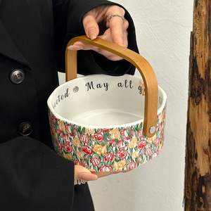 水彩油画般郁金香陶瓷手提水果篮轻奢家用果盘零食盘高颜值伴手礼