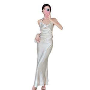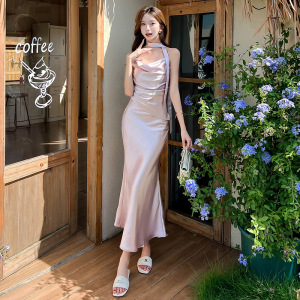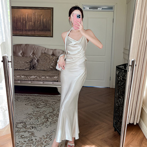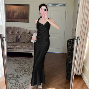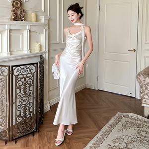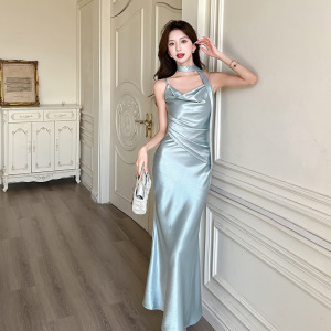 フレンチセレブ風サテンスリムフィッシュテールスイングカラーヒップカバーフェイクツーピースサスペンダーロングドレスカスタムメイド