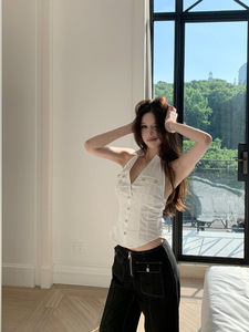 无袖衬衫女夏季美式复古工装挂脖白色小上衣