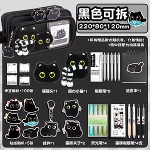 【猫のデラックス学習セット】取り外し可能な黒/スカーフ子猫+猫の頭+猫のブラシペン4本+小さな白いペン5本+付箋100枚+ルーズリーフブック+ステッカー5枚