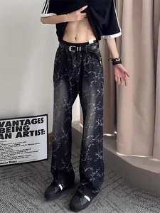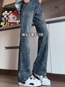 黑色荆棘提花牛仔裤男款夏季痞帅高级感微喇裤子美式高街vibe长裤