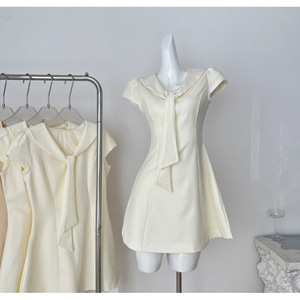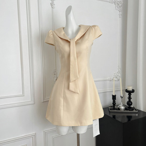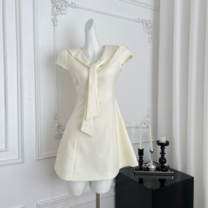 Qianjinfeng ネイビーカラードレス夏の新しいスタイルウエスト痩身気質ハイエンド半袖 A ラインスカート