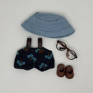フィッシャーマンハット + 花柄オーバーオール + 茶色のメガネ + 茶色のレインブーツ