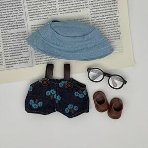 フィッシャーマンハット + 五芒星オーバーオール + 茶色のメガネ + 茶色のレインブーツ