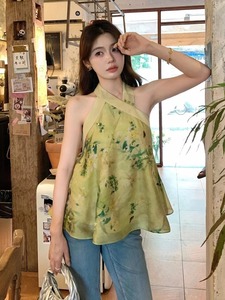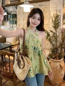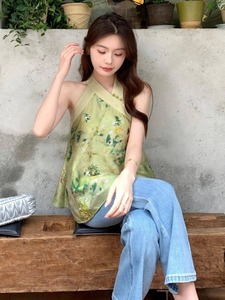 夏季流行漂亮小衫薄款轻奢高级感独特绝美新中式绿色挂脖印花上衣