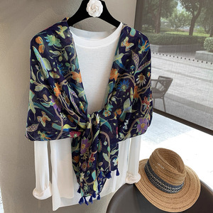 スカーフ越境輸出シルクスカーフ春夏カラーボヘミアンカラフルな鳥の花バリアンカスフリンジショール女性用