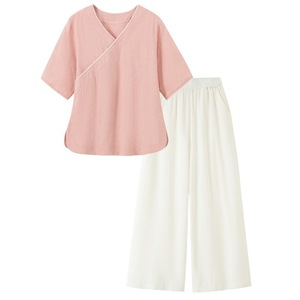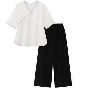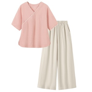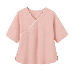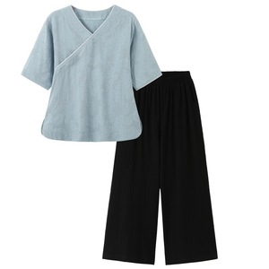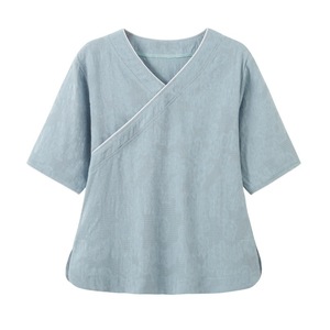 夏の新しい中国風の女性の文学レトロな綿とリネンの V ネック半袖トップカジュアル禅茶服セット