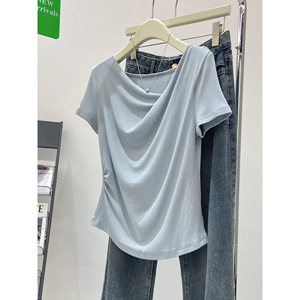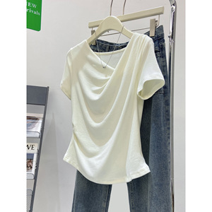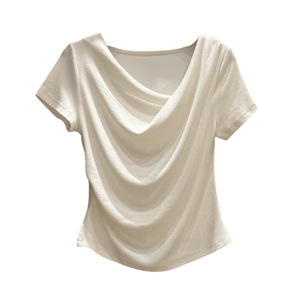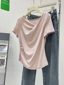 優しいスタイルの不規則なプリーツスイングカラー半袖Tシャツ、女性用、夏の気質、シンプルで万能なトップス、純粋な欲望のボトリングシャツ