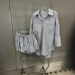 2025 夏の新スタイルミッドスリーブルーズオフショルダーシャツジャケット女性の花のつぼみスタイル二層バブルショーツストライプセット