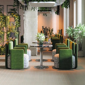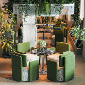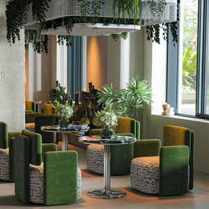 ラウンドテーブル 60 台 + 緑色のソファ 4 台