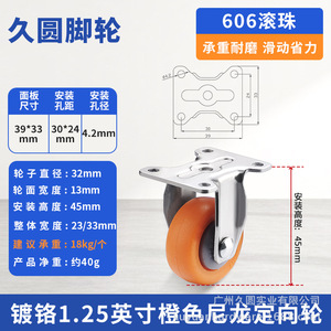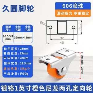 0.8英寸岔口孔位镀铬无轴承橙色橡胶定向轮(螺丝需另拍)