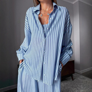 ブルーストライププリント快適な長袖ズボンベスト3点セット2025ヨーロッパとアメリカの秋の新しいクロスボーダーホーム服
