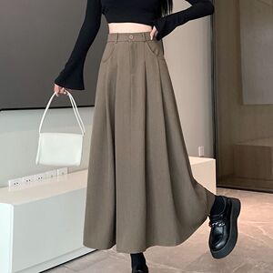 春と秋の女性用黒スーツスカート、ミドル丈、ハイウエスト、スリム、ドレープ、Aライン、大きな裾のアンブレラスカート、プリーツロングスカート