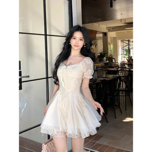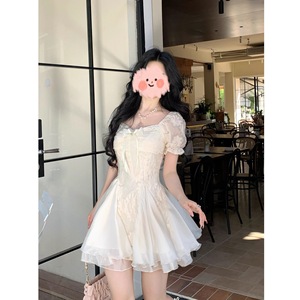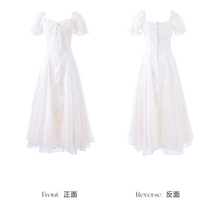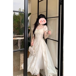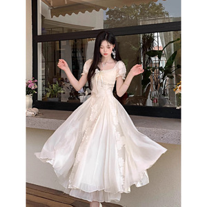 Blovelan白茶与风纯欲白月光气质刺绣花朵蓬蓬连衣裙度假风长裙女