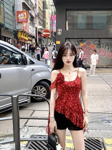 红色碎花不规则荷叶边吊带背心女夏季设计感收腰修身辣妹雪纺上衣