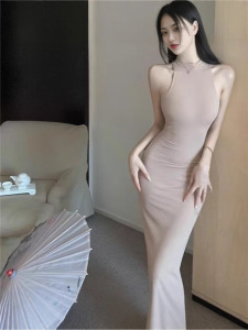 黒のホルターネックスリットハイウエストロングノースリーブハイカラースリムフィットボトリングドレスレディースヒップカバースカート新しいスタイル