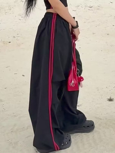 美式撞色条纹松紧腰休闲裤女春秋新款垂感运动伞兵裤显瘦阔腿裤子