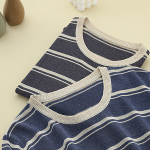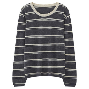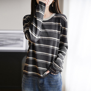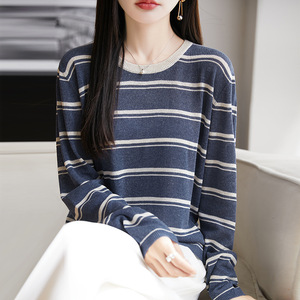 2025夏季新款条纹针织衫女长袖亚麻罩衫上衣打底圆领t恤韩系宽松