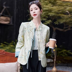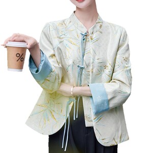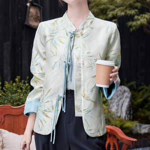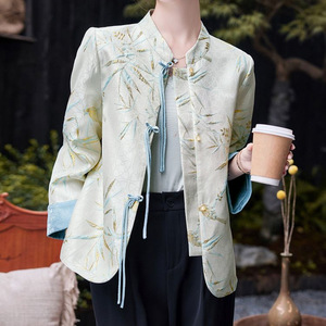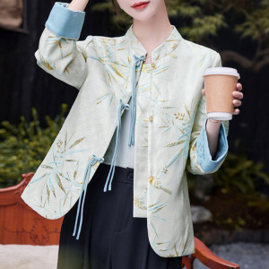 新中式国风印花圆领长袖外套女春秋新款小个子盘扣气质简约上衣