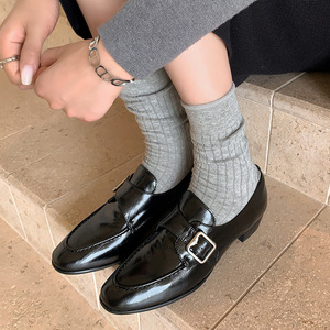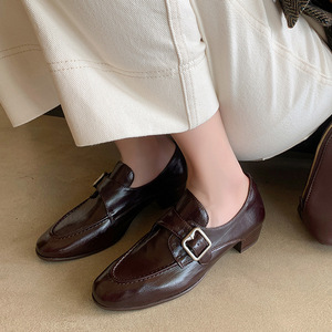 西洋風通勤作業靴ベルトバックル牛革ローファー2025秋厚底ローヒールラウンドトゥ本革深口シングルシューズ女性用