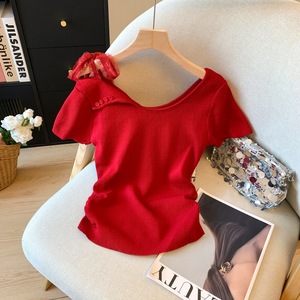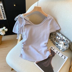夏季露肩蕾丝蝴蝶针织衫夏季新款短款小众收腰别致显瘦上衣