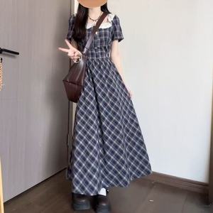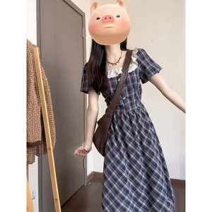 学院风甜美时尚高腰修身格纹连衣裙女夏季收腰显瘦蕾丝拼接A笙陇