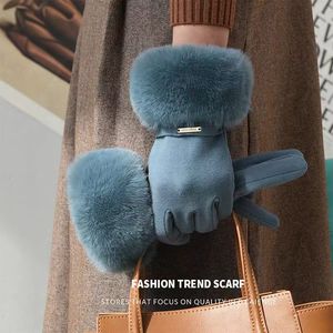 デロンイミテーションラビットファー女性用手袋、保温、タッチスクリーン対応、防風、サイクリング、裏起毛、厚手、アウトドア、秋冬用手袋、卸売