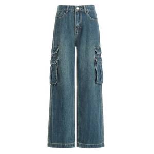 批发复古蓝水洗工装裤牛仔裤女美式复古高腰直筒阔腿裤