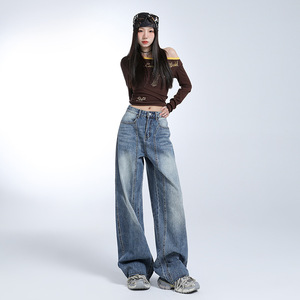 ドレープウォッシュアメリカンワイドレッグジーンズ女性のための 2025 夏の新しいハイウエストスリムレトロルーズデザイン鎌パンツ