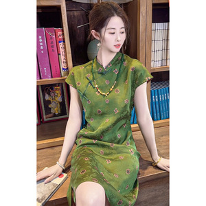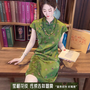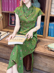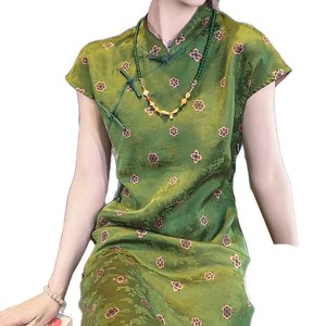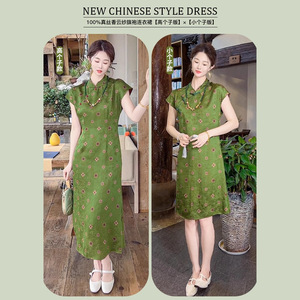 新しい中国風のシルクチャイナドレス、中国風のレトロなボタンダウンカラードレス、夏のエレガントなスタイルのプリントロングドレス