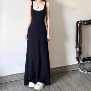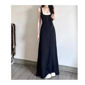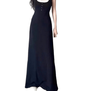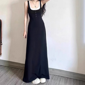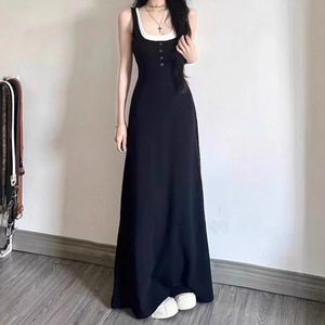 黒のロングスカート偽ツーピースヘップバーンスタイルリトルブラックドレスプラセンタフレンチ年齢軽減痩身サスペンダードレス女性の夏服