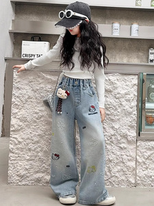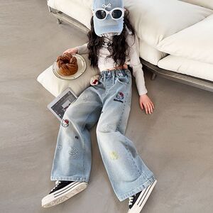 女の子パンツ 2025春秋新作 女の子中学生刺繍ジーンズ 中学生ストレートワイドパンツ