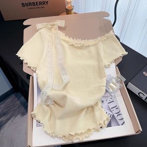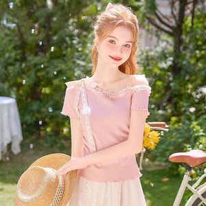 Xiaoxiangfengの新しい夏のスタイルの女性の甘いピンクのオフショルダー斜め肩ウエスト痩身純粋な欲望ボトリングシャツ半袖Tシャツ