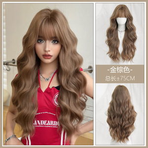 女性用ウィッグ、ロング巻き毛、前髪あり、ゴールデンブラウン、フルヘッドギア、化学繊維シミュレーション高温シルクウェーブロング巻き毛