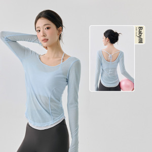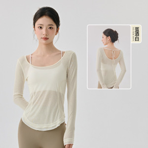 女性用ヨガカバーアップ、夏用薄手、微透けU字型ストラップ、美しい背中スポーツカバーアップ、高級コントラストカラー長袖ヨガウェア
