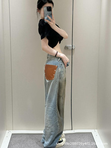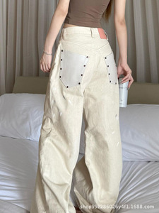 Nanyou 品質 25SS レトロなダメージ加工レザーポケットステッチリベットルーズワイドレッグダーティージーンズカップルスタイル