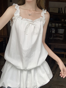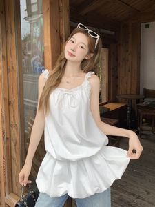 ガーリースタイルの白いレースアップ耳付きベストサスペンダー女性の夏の2025新しいデザインの美しいつぼみトップ