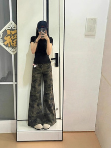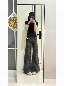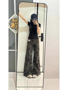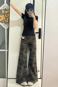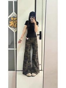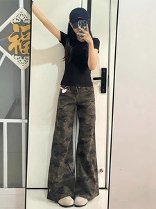 美式迷彩微喇低腰牛仔裤女2025夏季新款复古显瘦垂感不贴腿喇叭裤