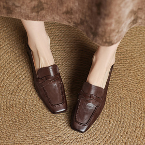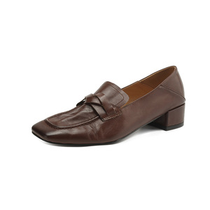 ウォッシュド第一層牛革ローファー 2025 秋厚いミディアムヒールスクエアトゥツイストノット本革通勤深口シングルシューズ女性用