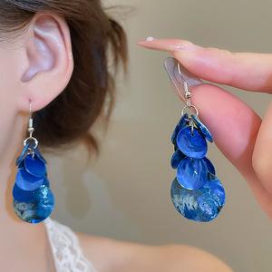 小さな新鮮なグラデーションブルーシェルラウンドイヤリングライト高級ハイエンドファッションイヤーフックデザインニッチイヤリング卸売