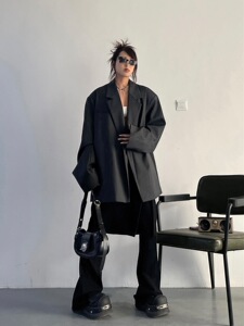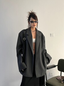 秋季新款时尚英伦慵懒风休闲宽松显瘦复古灰色条纹廓形西装外套女