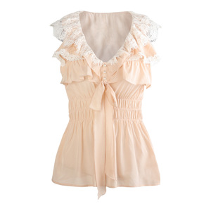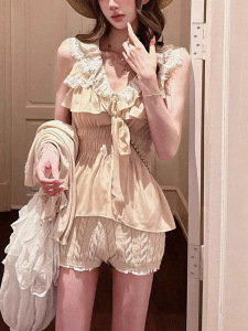 昔ながらのvivi和風ヌードシルクとレースフリルVネックレーストップウエストリボンサスペンダー