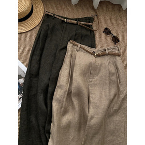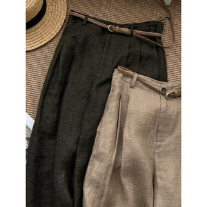 オールドマネースタイルカーキリネンワイドレッグパンツ女性のための 2025 夏ハイウエスト薄型スリムリラックスストレートカジュアルパンツ