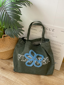 フラワーデニムトートバッグ-ミリタリーグリーン