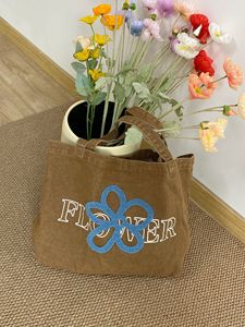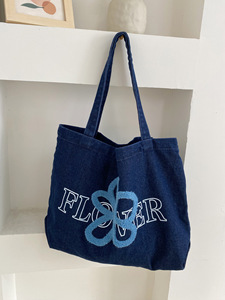 レトロニッチデニムトートバッグ、洗濯可能、色褪せしない、韓国風刺繍フラワーショルダーバッグ、春夏万能通勤バッグ