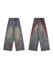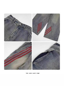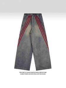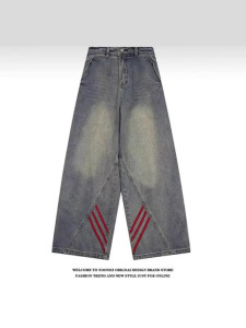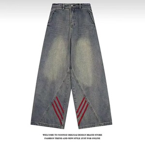 三条杠宽松阔腿牛仔裤男女潮牌朋克做旧洗水织带拼接条纹直筒长裤
